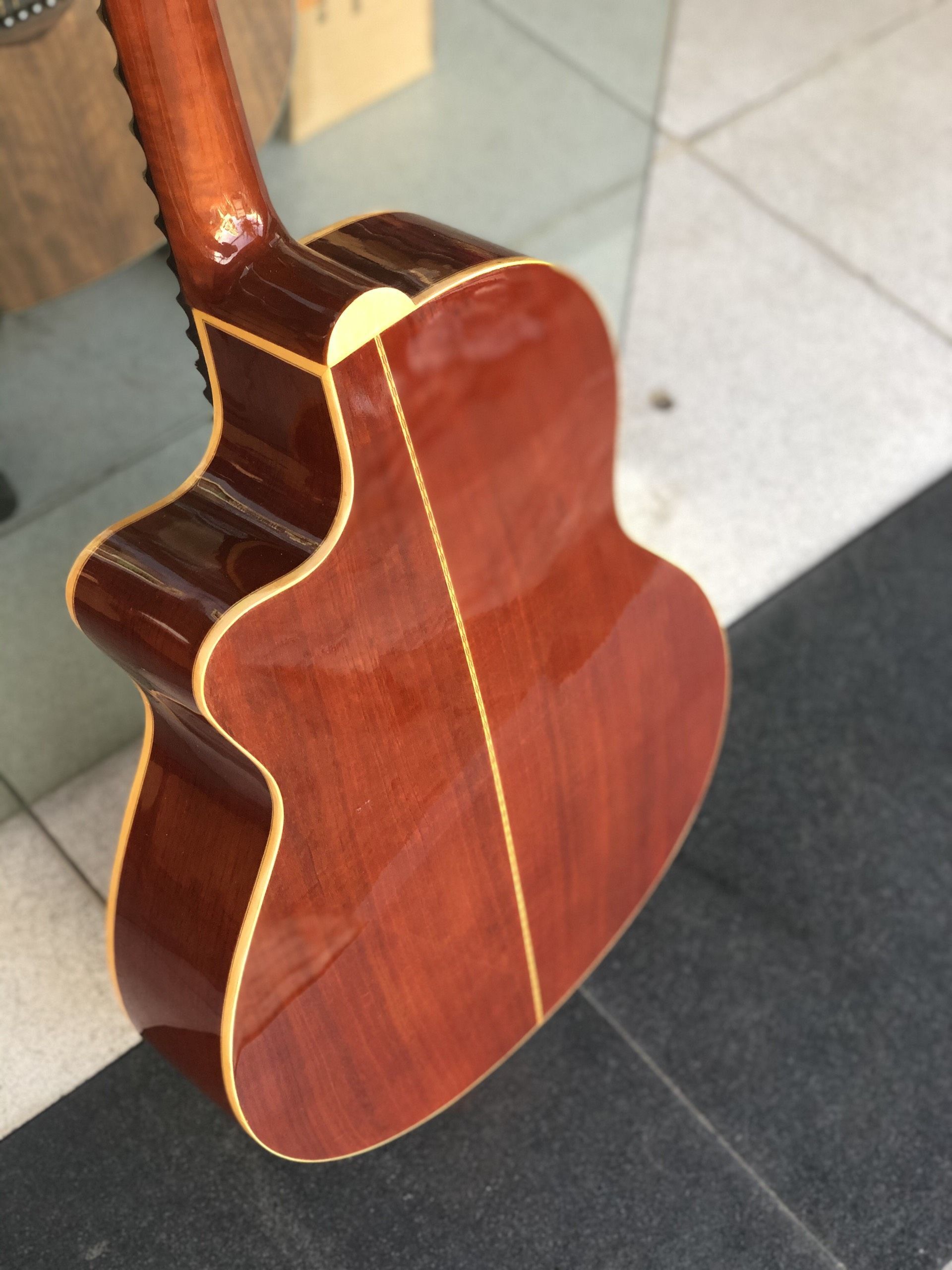 Đàn guitar thùng cổ nhạc sơn bóng cùng với những điểm nhấn vô cùng bắt mắt. Mặt thùng đàn được viền quanh bởi hai màu trắng, nâu tạo điểm nhấn lạ mắt cho cây đàn.