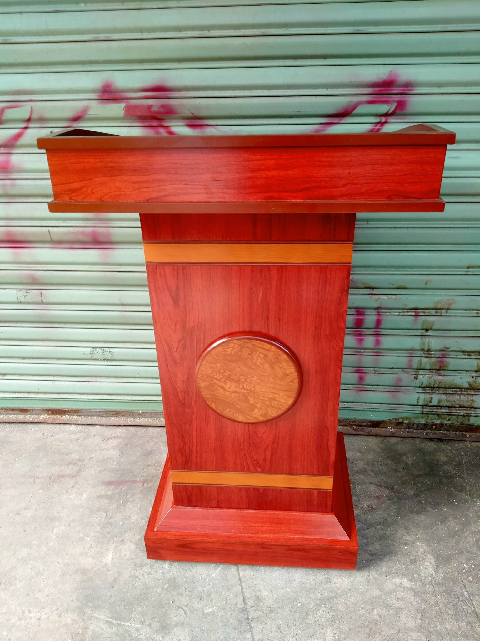 Bục phát biểu chấm trònđược thiết kế đẹp mắt với những đường thẳng góc cạnh mạnh mẽ. Trên thân bục được chạm những đường thẳng khắc chìm tinh tế. Ở giữa thân bục phát biểu được điêu khắc một hình tròn nổi làm điểm nhấn. Ngoài ra bục được khoác lên mình màu sắc đỏ nâu vô cùng nổi bật.