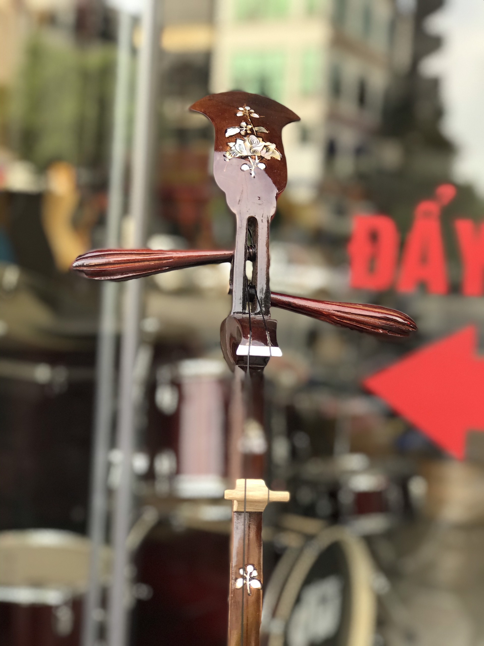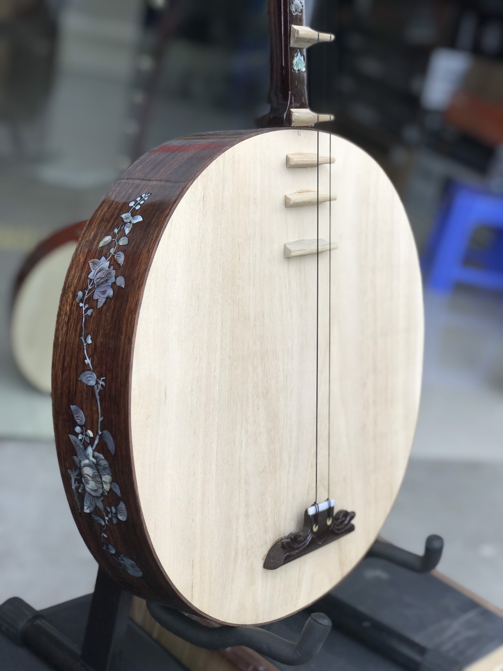 – Hình thức khảm trai hoa văn toàn thân đàn và cần đàn.