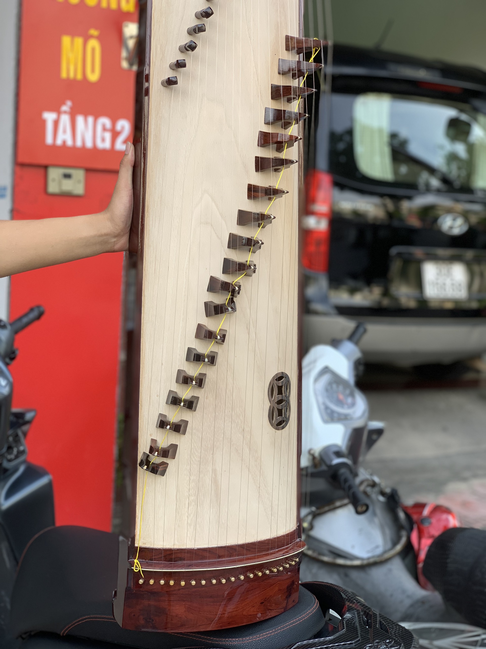– Chất liệu: thân đàn gỗ cẩm, mặt trên và dưới bằng gỗ ngô đồng.