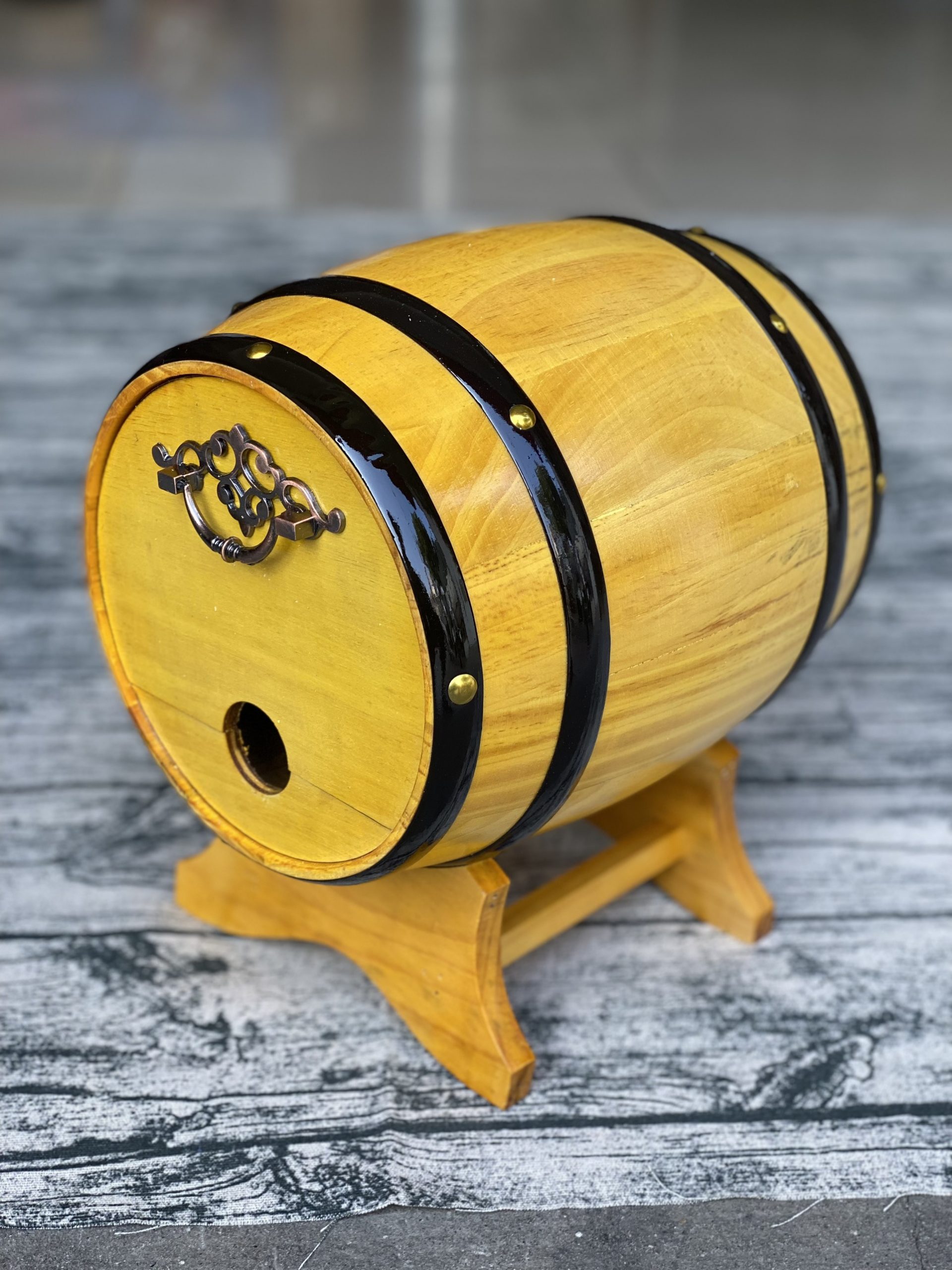 Được làm từ chất liệu gỗ thông từ tự nhiên, những chiếc thùng gỗ đựng rượu có trọng lượng nhẹ; bề ngoài thẩm mỹ. Thùng được sơn bằng gam màu vàng vô cùng nổi bật. Thiết kế thùng có dáng nằm ngang với giá đỡ, nắp thùng và lỗ khoét nhỏ để cho rượu vào.Thùng rượu vang có dung tích vừa phải; chỉ khoảng 5 lít; giúp bạn sử dụng rượu dễ dàng và đỡ lãng phí hơn.