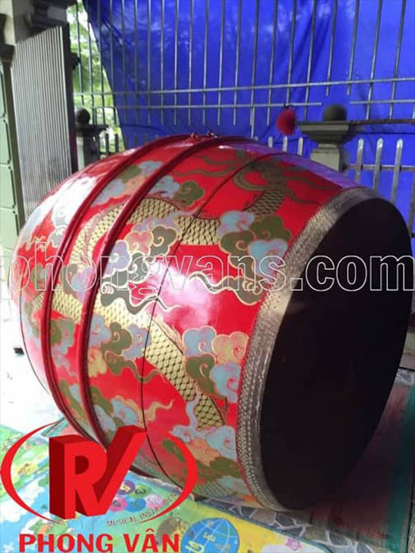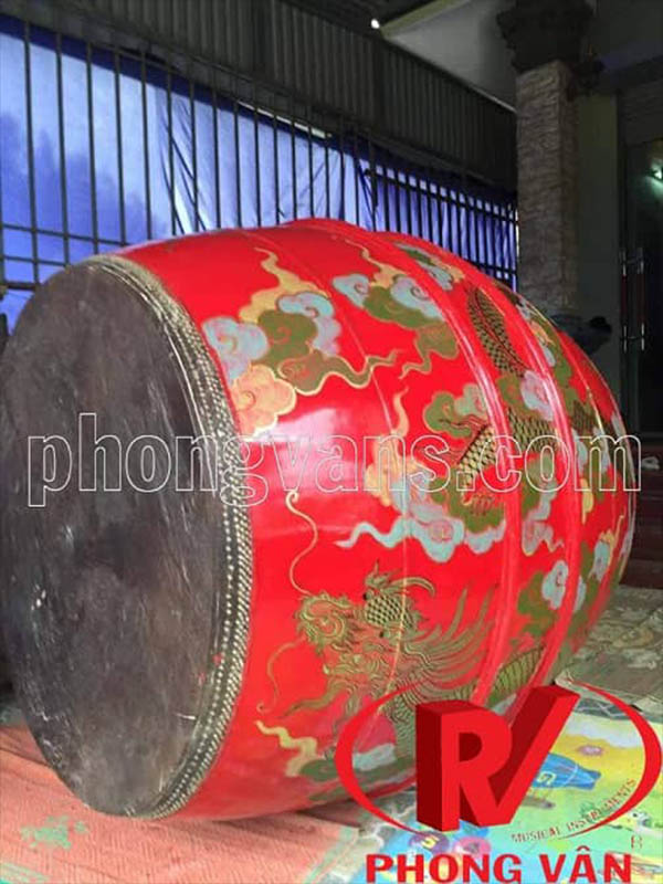 Cơ sở Phong Vân là nơi sản xuất và cung cấp các loại trống đình làng chất lượng. Chính vì vậy, chúng tôi giới thiệu đến các bạn trống đình làng Việt Nam với chiều rộng 1m2 và chiều cao 1m5. Trống được ghép thủ côngtừ những thanh gỗ mít cứng cáp. Sau đó, dùng các vòng thép niềng lại một cách chắc chắn. Mặt trống bịt bằng da trâu già, những hàng đinh đồng đóng xung quanh thành mặt trống làm căng da mặt trống tạo tiếng trống mạnh mẽ và vang xa. Trống được sơn màu đỏ và vẽ hình rồng mây, một nét vẽ mang đậm nét hồn dân tộc Việt Nam .