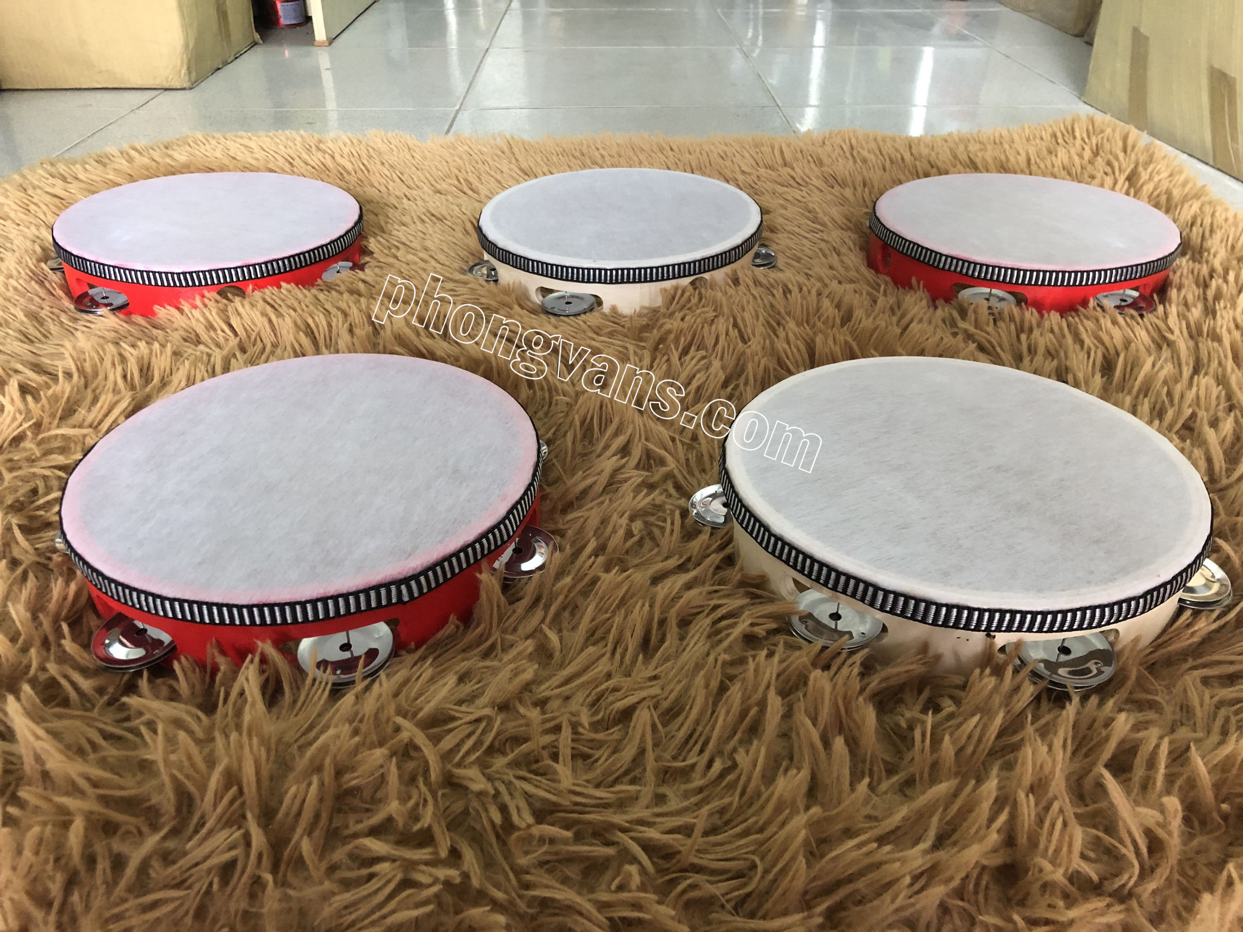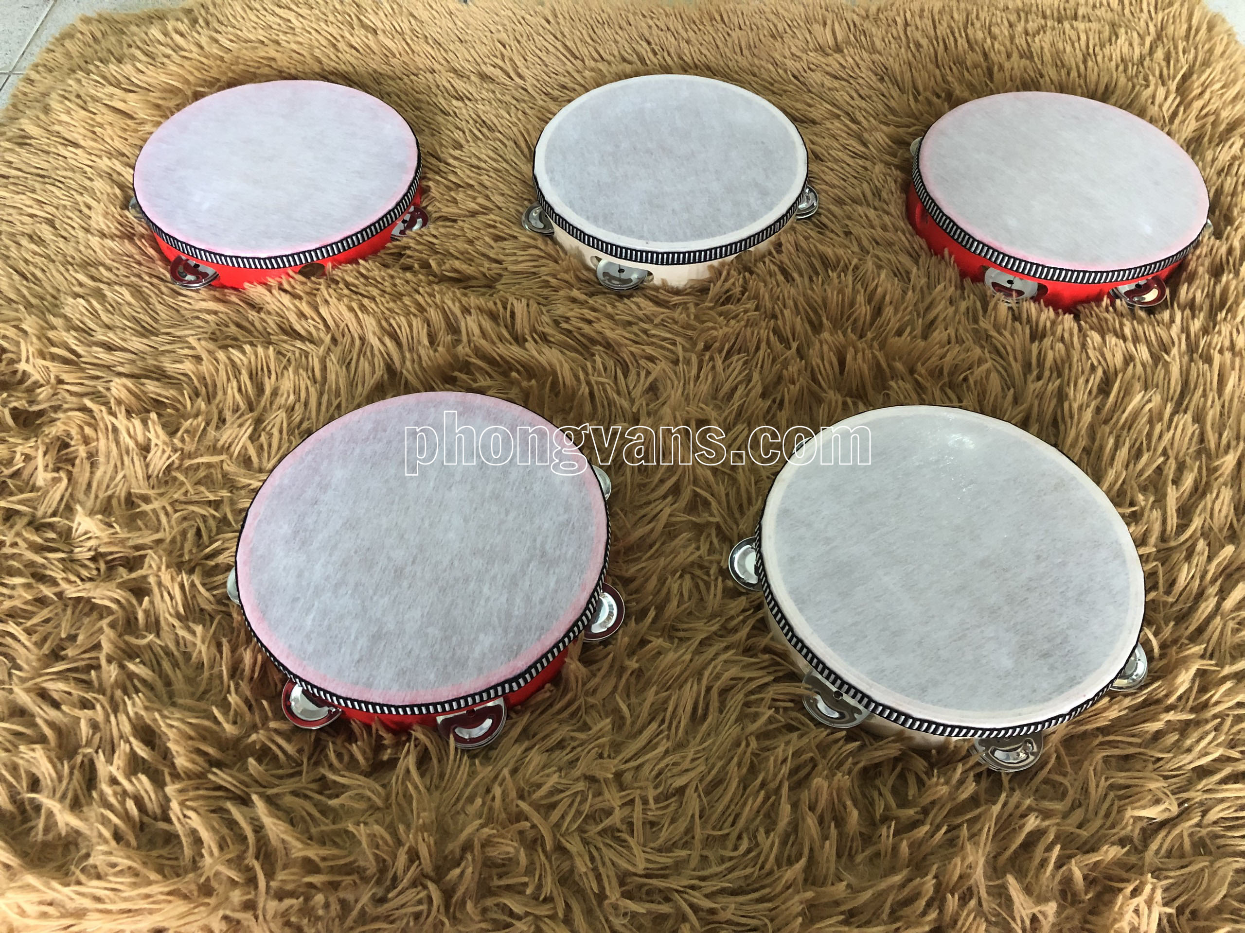 Trống được làm từ chất liệu gỗ, mặt trống làm từ chất liệu da nhân tạo mỏng, xung quanh là các lục lạc thép không gỉ giúp phát ra âm thanh vui nhộn, sôi động